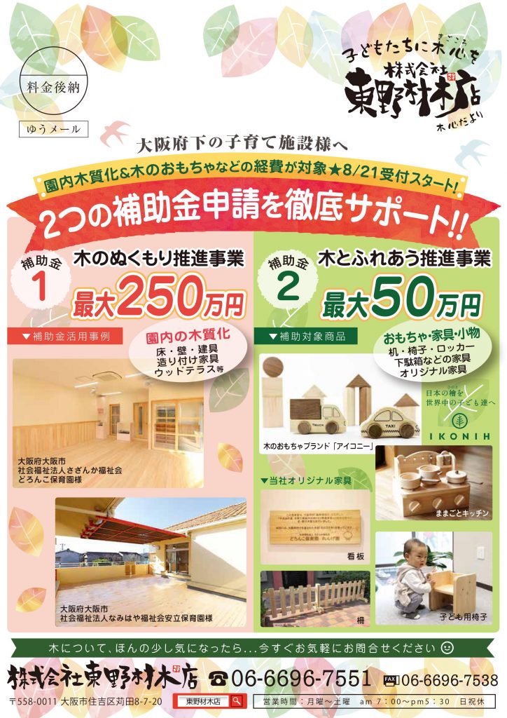 対象施設内の子どもが利用する場所(※1)の内装等(※2)及び木製建具を「おおさか材」(※3)を使用して木質化するために要する工事請負費及び設計費